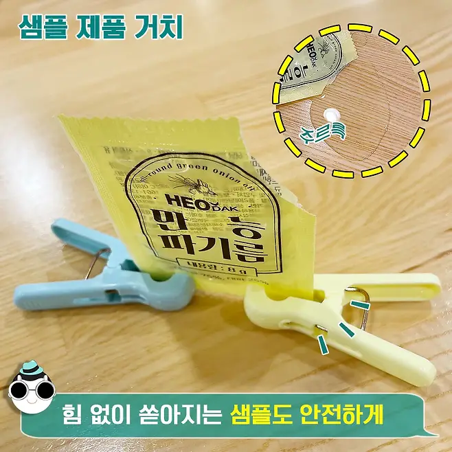 샘플 내용물도 흘러나오지 않아 아껴서 사용할 수 있고, 주변을 더럽히지도 않으며, 입구가 바닥에 닿지 않아 위생적으로 사용할 수 있어요! 빨래 집게 하나로 일석삼조의 효과가 ^_^