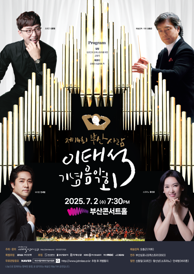 올해 음악회도 예년처럼 예술가들의 기부로 이뤄진다. 오충근 예술감독의 지휘와 부산심포니오케스트라의 연주로 길망의 오르간과 오케스트라를 위한 교향곡 1번, 베르디의 오페라 리골레토의 주요 아리아를 들을 수 있다. 오르가니스트 신동일, 소프라노 황신녕, 바리톤 안세범 등이 무대에 오른다.
