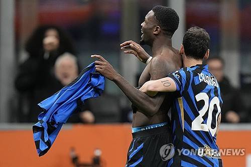 Inter Milan's Marcus Thuram, left, celebrates after scoring the second goal against Como during a Serie A soccer match between Inter Milan and Como at the San Siro stadium in Milan, Italy, Monday, Dec. 23, 2024. (AP Photo/Luca Bruno)
