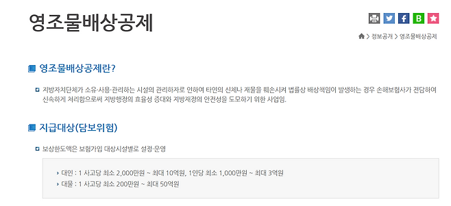 지방자치단체가 소유·사용, 관리하는 시설의 관리하자로 인하여 타인의 신체나 재물을 훼손시켜 법률상 배상책임이 발생하는 경우 손해보험사가 전담하여 신속하게 처리함으로써 지방행정의 효율성 증대와 지방재정의 안전성을 도모하기 위한 사업입니다.