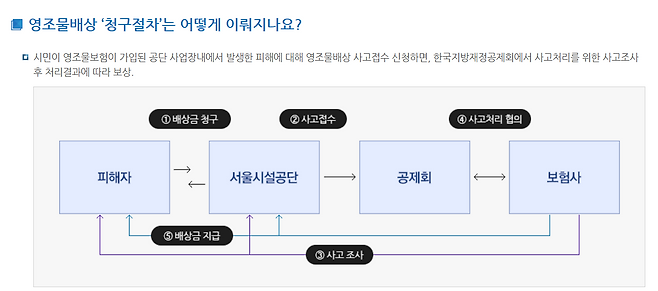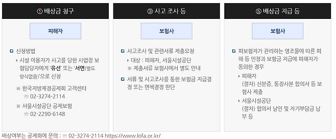 시민이 영조물 보험이 가입된 공단 사업장 내에서 발생한 피해에 대해 영조물 배상 사고접수 신청하면, 한국지방재정공제회에서 사고처리를 위한 사고 조사 후 처리 결과에 따라 보상됩니다. 보험금은 청구신청부터 수령까지 최소 1~2개월 정도의 시간이 소요됩니다.