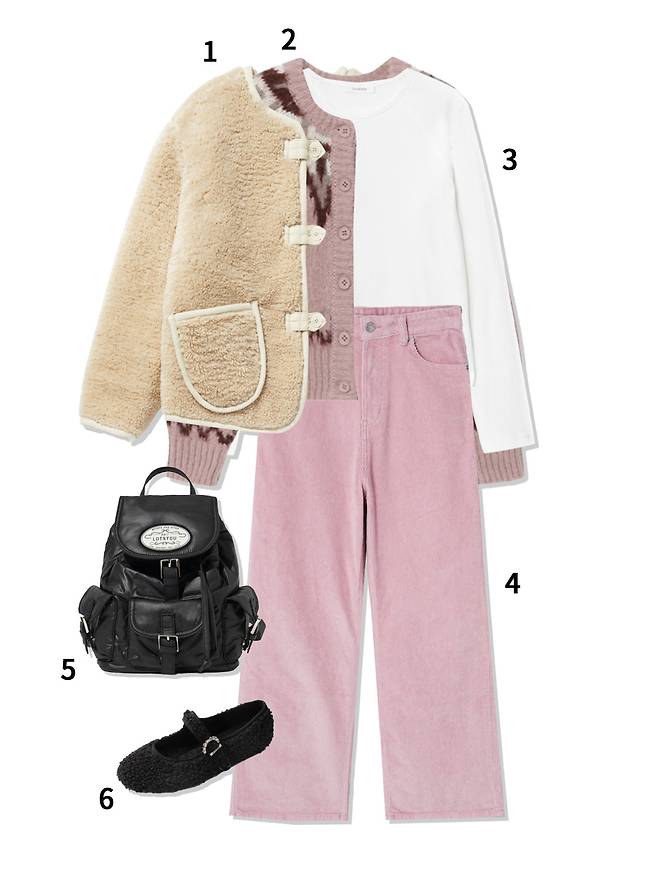 1 가디건 : 리엘(155,000원) 2 패딩 : 시야쥬(229,000원) 3 스크런치 : oar(16,000원) 4 스커트 : H&M(39,900원) 5 백팩 : 라츠유(129,000원) 6 메리제인슈즈 : 슈하이(99,900원)
