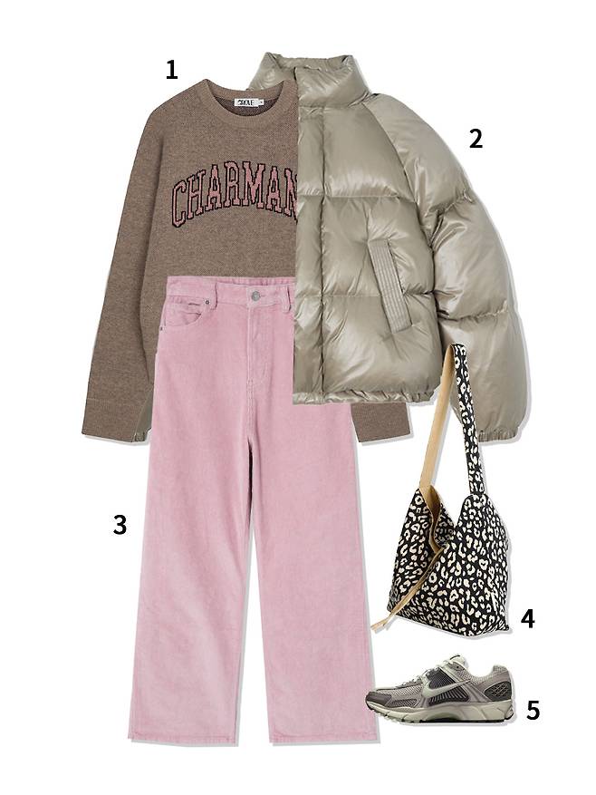 1 니트 : 그로브(103,000원) 2 패딩 : 시야쥬(229,000원) 3 팬츠 : 에잇세컨즈(54,900원) 4 양면 토트백 : 쏘차밍(55,000원) 5 운동화 : 나이키(189,000원)