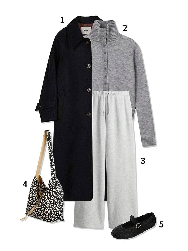 1 코트 : 아바몰리(328,000원) 2 가디건 : 미치코런던(64,000원) 3 조거팬츠 : H&M(19,900원) 4 양면 토트백 : 쏘차밍(55,000원) 5 메리제인슈즈 : 슈하이(99,900원)