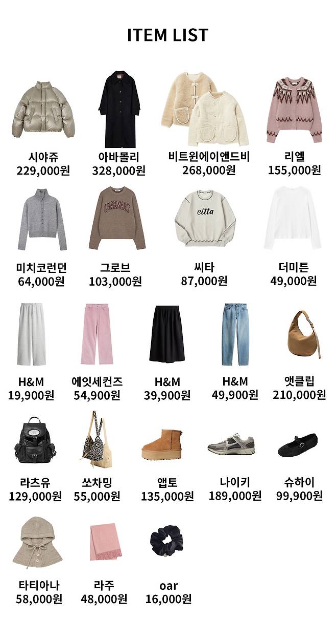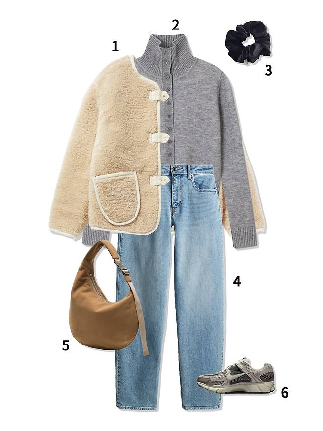 1 양면재킷 : 비트윈에이앤드비(268,000원) 2 가디건 : 미치코런던(64,000원) 3 스크런치 : oar(16,000원) 4 데님 : H&M(49,900원) 5 가방 : 앳클립(210,000원) 6 운동화 : 나이키(189,000원)