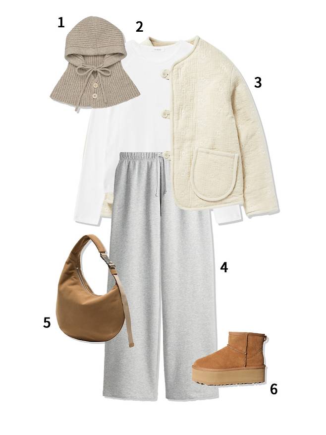 1 바라클라바 : 타티아나(58,000원) 2 가디건 : 미치코런던(64,000원) 3 패딩 : 시야쥬(229,000원) 4 조거팬츠 : H&M(19,900원) 5 가방 : 앳클립(210,000원) 6 어그부츠 : 앱토(135,000원)