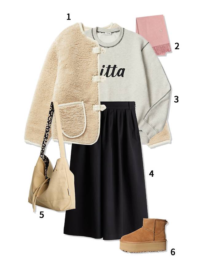 1 양면재킷 : 비트윈에이앤드비(268,000원) 2 머플러 : 라주(48,000원) 3 스웨트셔츠 : 씨타(87,000원) 4 스커트 : H&M(39,900원) 5 양면 토트백 : 쏘차밍(55,000원) 6 어그부츠 : 앱토(135,000원)