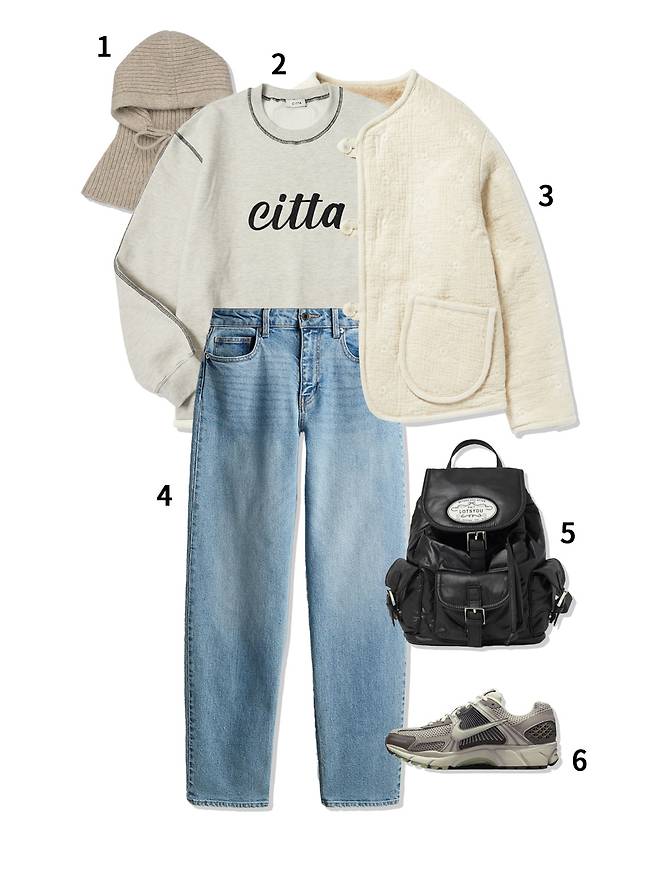 1 바라클라바 : 타티아나(58,000원) 2 스웨트셔츠 : 씨타(87,000원) 3 양면재킷 : 비트윈에이앤드비(268,000원) 4 데님 : H&M(49,900원) 5 백팩 : 라츠유(129,000원) 6 운동화 : 나이키(189,000원)