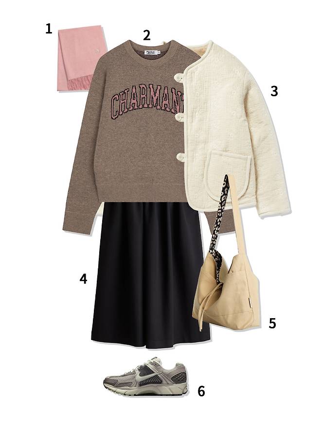 1 머플러 : 라주(48,000원) 2 니트 : 그로브(103,000원) 3 양면재킷 : 비트윈에이앤드비(268,000원) 4 스커트 : H&M(39,900원) 5 양면 토트백 : 쏘차밍(55,000원) 6 운동화 : 나이키(189,000원)