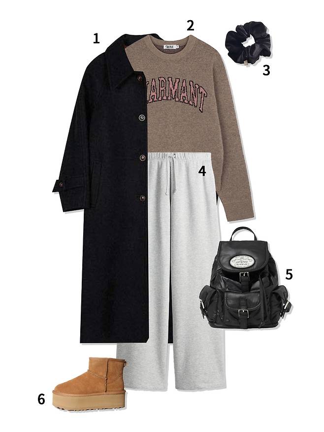 1 코트 : 아바몰리(328,000원) 2 니트 : 그로브(103,000원) 3 스크런치 : oar(16,000원) 4 조거팬츠 : H&M(19,900원) 5 백팩 : 라츠유(129,000원) 6 어그부츠 : 앱토(135,000원)