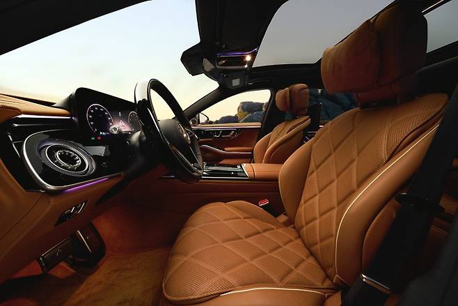 외관에서 가장 도드라진 변화는 프론트 그릴이다. 기존 대비 20% 확대됐으며, 발광 프레임과 조명이 들어오는 'Maybach' 레터링이 더해졌다. C필러의 마이바흐 로고와 후드 위 별 엠블럼에도 조명 적용이 가능하다. 브랜드 정체성을 차체 곳곳에 각인하려는 최근 럭셔리 업계의 흐름을 충실히 따른 결과다. 호불호가 갈릴 수 있는 지점이지만, 밤거리에서 마이바흐임을 단번에 알아볼 수 있다는 점에서 브랜드 전략으로서는 분명한 효과를 기대할 수 있다.