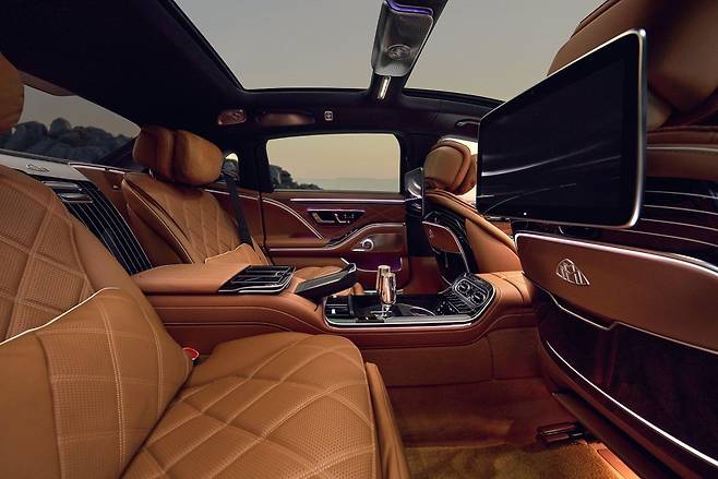 실내에서는 브랜드 최초로 비건 소재 옵션이 등장한다. 리넨과 재활용 폴리에스터를 혼방한 'Mirville' 텍스타일과 합성 가죽 ARTICO를 조합한 구성으로, 지속가능성에 대한 소비자의 관심이 마이바흐 오더 시트에도 반영되기 시작했다는 점에서 의미 있는 변화다. 물론 전통적인 럭셔리를 원하는 고객을 위한 '마누팍투어 메이드 투 메저' 프로그램도 건재하다. 수백 가지 도장 색상과 사실상 무제한에 가까운 가죽 조합이 기다리고 있다. 로베 & 베르킹의 은도금 샴페인 플루트와 10리터 냉장고 역시 후석 옵션의 자리를 지킨다.