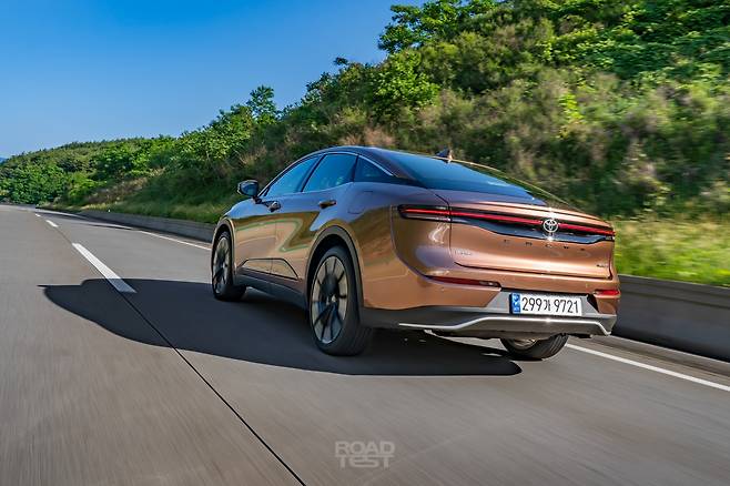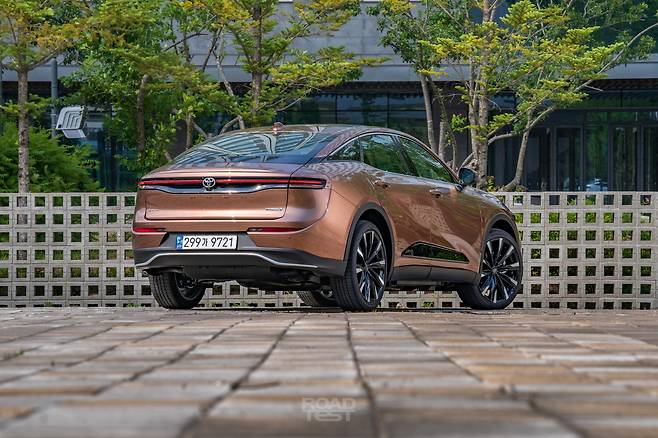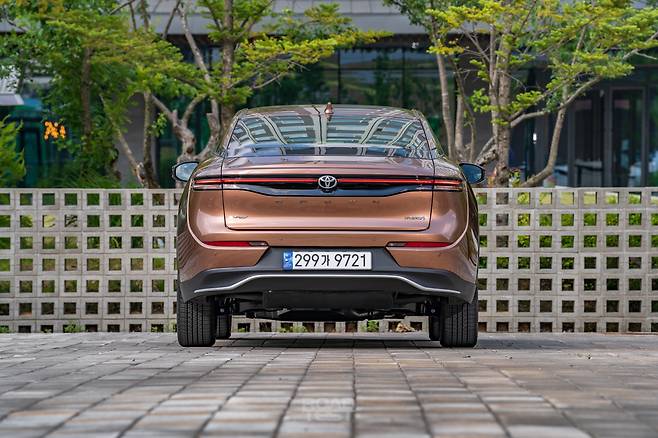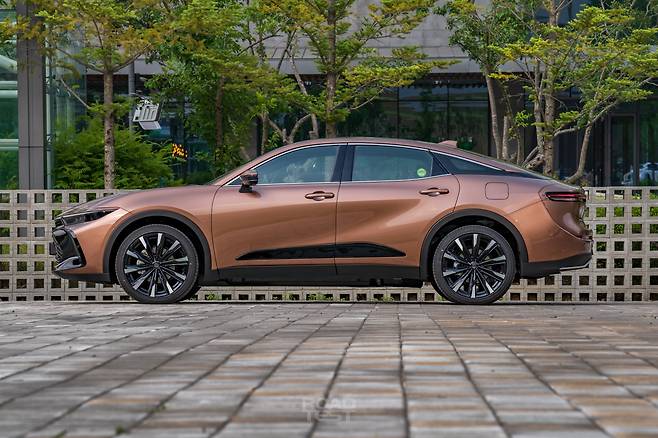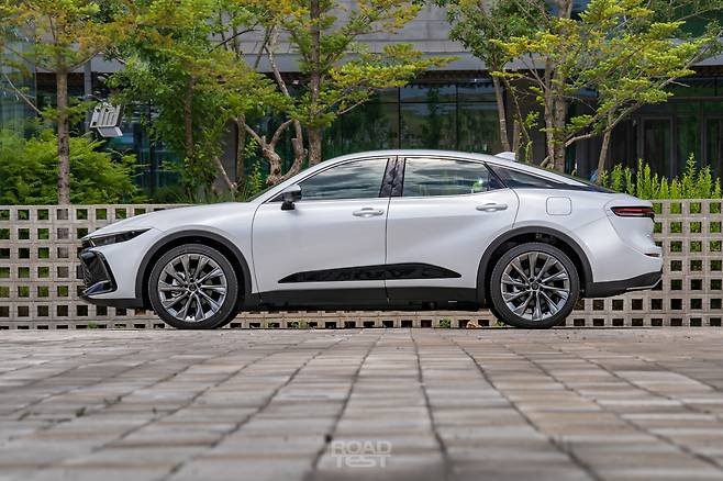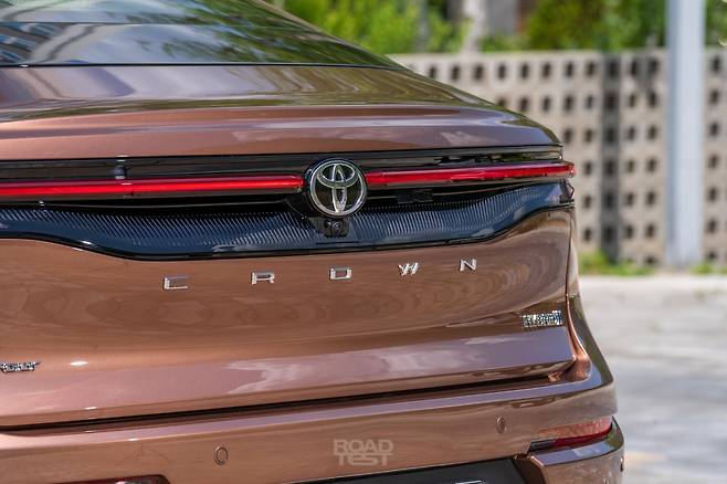 크라운의 차체 길이와 너비, 높이는 각각 4,980×1,840×1,540㎜. ‘동생’ 캠리와 비교하면 85㎜ 길고 95㎜ 높다. 휠베이스는 2,850㎜로 25㎜ 넉넉하다. 다만, 차체 길이에 비해 너비는 조금 작다. 그래서 대형차다운 ‘웅장함’을 기대하긴 어렵다. 대신 역동적이다. 이번 크라운의 핵심은 측면 디자인. 꽁무니까지 매끄럽게 떨어지는 루프 라인이 남다른 존재감을 뽐낸다.