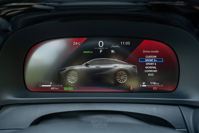 두 번째, 조금 부자연스러운 움직임이다. 앞서 설명한 대로 2.4 모델은 조향 감각이 한층 예리하다. 그런데 크라운은 기본적으로 지상고가 높고 서스펜션 스크로크가 길다보니, 부드러운 상하 움직임과 예리한 좌우 움직임(조향에 따른)의 궁합이 썩 조화롭진 않다. 2.5 모델엔 없는 스포츠+ 모드까지 있지만, 큰 변화는 없었다. 225㎜에 불과한 앞뒤 타이어 너비도 348마력의 출력을 온전히 받아내기엔 버거웠다.