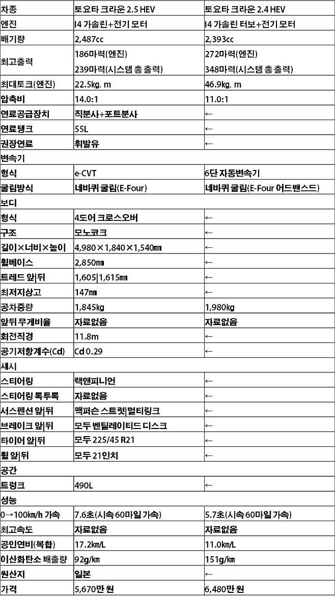 출력 차이도 돋보인다. 전륜 모터의 최고출력은 2.5 모델이 더 강력한데, 반대로 후륜 모터의 출력은 2.5 모델이 40㎾, 2.4 모델이 58.6㎾로 ‘역전’이다. 엔진과 합산한 시스템 최고출력은 348마력으로, 크라운 2.5 하이브리드보다 100마력 이상 강력하다.
