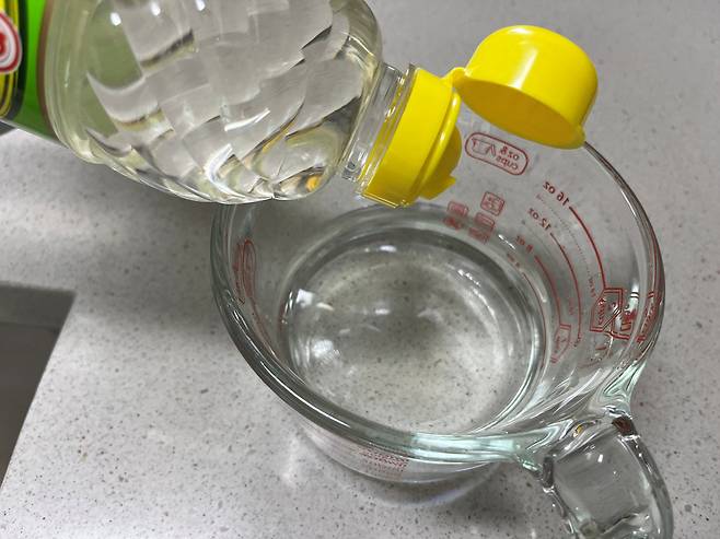 식초를 원액으로만 사용하면 냄새가 너무 독해서 저는 식초와 물 1:1 비율로 혼합하여 사용하고 있습니다. 전자레인지 가능 용기에 식초와 물을 비율대로 넣어주세요.