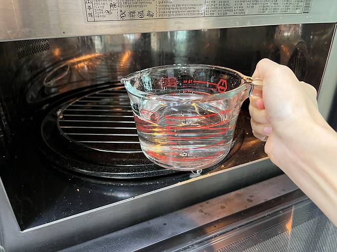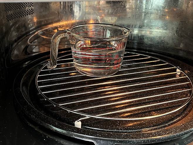 전자레인지에 식초물을 넣고 3분~4분 돌려줍니다. 이때, 식초물이 데워지면서 전자레인지 내부에 수증기가 끼게 됩니다.