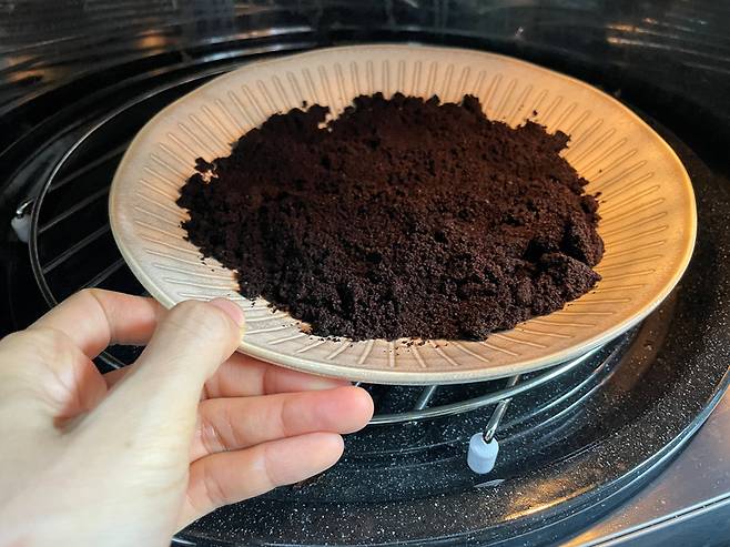 원두 찌꺼기를 평평한 접시 등에 담은 후 전자레인지에 넣어 2분가량 돌립니다. 원두 찌꺼기는 오래 가열될 경우 화재 등 위험이 있기 때문에 비교적 짧은 시간 돌려주세요.