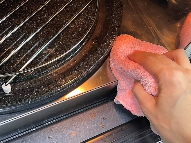 안쪽에 김이 서린 상태에서 행주로 안쪽 먼지 등을 제거합니다. 김이 서린 상태에서는 먼지나 얼룩 등이 더 잘 닦이는 효과가 있습니다.