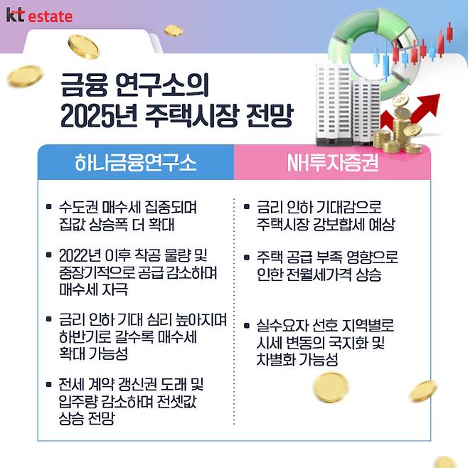 금융계에서는 내년 주택시장이 금리 인하, 공급 부족 등의 영향으로 상승 또는 강보합세를 이룰 것으로 전망했습니다. 하나금융연구소가 지난 10월 발표한 ‘2025년 부동산시장 전망’ 보고서에 따르면, 내년에는 대출 규제 등 차입 여력 제한에도 실수요자 매수 심리가 확대되면서 완만한 상승세가 일어날 수 있다고 전망했습니다.