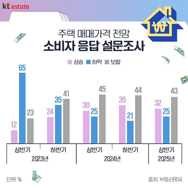 그렇다면 부동산 수요자들의 생각은 어떨까요? 지난 11월 6~18일 부동산R114가 전국 1306명을 대상으로 ‘2025년 상반기 주택시장 전망’ 설문 조사를 진행했는데요. 그중 상승 응답이 32%로 올해 하반기 전망 조사 때와 비교해 약 3% 감소했지만, 하락 응답(25%)보다는 높아 눈길을 끌었습니다.