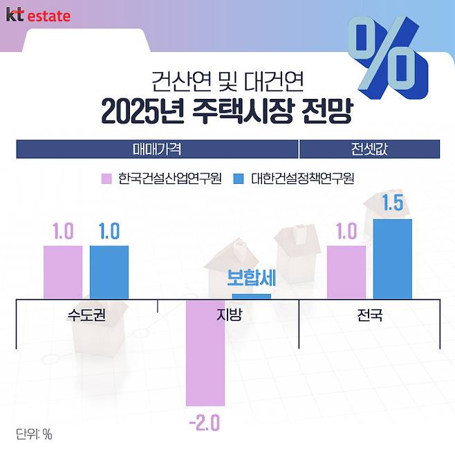 다음으로 대한건설정책연구원(이하 대건연)의 전망을 살펴볼까요? 대건연은 11월 26일 열린 ‘2025년 건설·주택 경기 전망 세미나’에서 내년 주택매매가격은 수도권이 1% 상승하지만, 비수도권은 보합세를 나타내리라 예측했습니다. 반면 전셋값은 수도권은 2%, 지방은 1% 상승하겠다고 전망했습니다.
