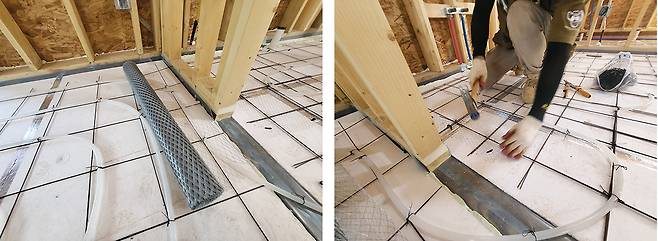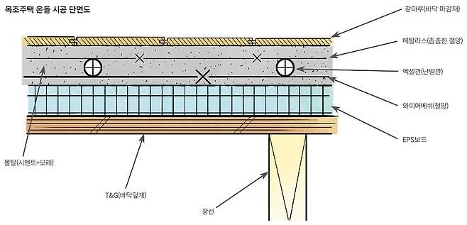 위 그림은 목조주택 2층의 온돌구조를 보여주는 단면도다. 장선이 있고 그 위에 T&G(바닥 덮개 합판), 단열과 층간 소음을 줄여줄 EPS보드 그리고 200㎜ 규격의 와이어 메쉬 철망이 있다. 이 철망은 엑셀관(난방관)의 고정을 위해 필요하며 그 위에 엑셀관을 200㎜ 간격으로 고정하면 된다. 여기서 중요한 자재는 그 위에 있는 메탈라스라는 촘촘한 철망을 얹고 몰탈을 타설한다.