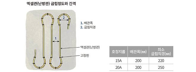 * 엑셀관(난방관) : 15㎜, 20㎜ 규격을 주로 사용하게 되며 엑셀관 내부에 보일러 온수가 들어가 순환하면서 바닥을 데운다. 수명은 40년이며 아래 그림처럼 두께별 굽힘 거리가 있는데, 이보다 많이 구부리면 찌그러지는 특성이 있어 유의해야 한 다. 겨울철 시공은 특히 유의해야 하며 한번 찌그러진 제품은 폐기하고 재시공해야 한다. 아래 1번 배관폭은 200㎜ 이내로 시공해야 난방효과를 충분히 낼 수 있다.