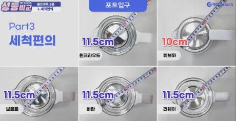 모든 제품이 손을 넣어서 세척하기에 수월한 편이었습니다. 벤브와가 주입구 직경이 10cm로 짧고, 바닥으로 갈수록 넓어지는 삼각형태라 상대적으로 조금 불편했고, 윈크라우드, 리웨이, 바란, 보르르 분유포트는 11.5cm의 원통형 구조라 조금 더 편했습니다.