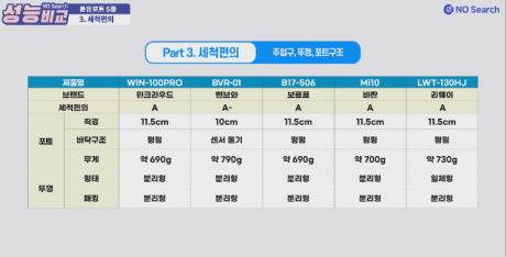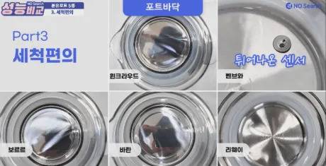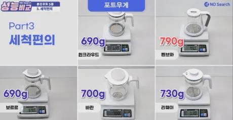 포트의 무게는 벤브와가 790g으로 가장 무게가 있었지만, 보르르, 윈크라우드 690g, 바란 700g, 리웨이 730g으로 모든 제품이 800g 이하의 무게로 손으로 들고 세척하는 데 큰 어려움은 없었습니다.