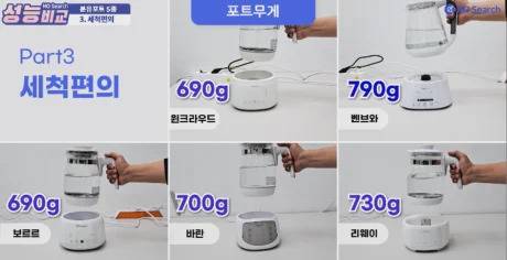 포트의 무게는 벤브와가 790g으로 가장 무게가 있었지만, 보르르, 윈크라우드 690g, 바란 700g, 리웨이 730g으로 모든 제품이 800g 이하의 무게로 손으로 들고 세척하는 데 큰 어려움은 없었습니다.