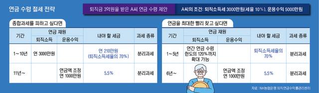 퇴직금으로 3억원을 받는 A씨로 가정을 해보자. A씨는 세액공제를 받지 않은 납입액은 모두 인출한 상태이며, 연금 운용수익은 5000만원이다. 퇴직소득세는 세율 10%를 적용받아 3000만원으로 책정됐다. 이에 퇴직금 3억원을 10년 동안 나눠 수령하면 퇴직소득세율의 70%에 해당하는 7% 세율이 적용돼 연금소득세는 연 210만원만 내면 된다. 운용수익이 인출되는 11년째부터는 5000만원을 1000만원씩 5년으로 나눠 받으면 종합과세를 피하고 분리과세를 선택할 수 있다.
