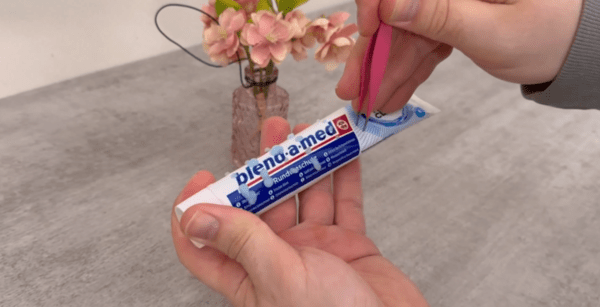 치약을 그대로 넣으면 튜브가 막히기 때문에, 칼로 구멍을 여러 개 뚫어 물이 들어가도록 해야 합니다. 치약은 일반형보다는 젤타입이 물에 잘 녹습니다. 약 2주 정도 지나면 효과가 줄기 때문에 새 치약으로 교체하면 됩니다.