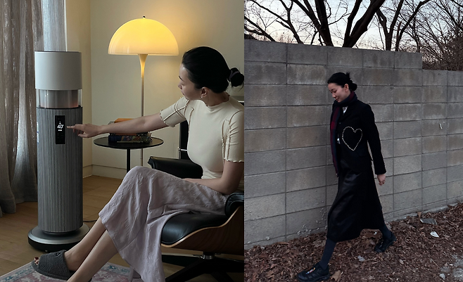 장윤주는 블랙 롱코트와 가죽 롱스커트, 그리고 스터드 장식의 하트 패턴이 들어간 재킷으로 포인트를 준 겨울 산책룩을 선보인다. 체크 머플러와 스니커즈, 두꺼운 양말로 실용성과 스타일을 동시에 잡았으며, 전체적으로 시크하면서도 개성 있는 분위기를 자아낸다.