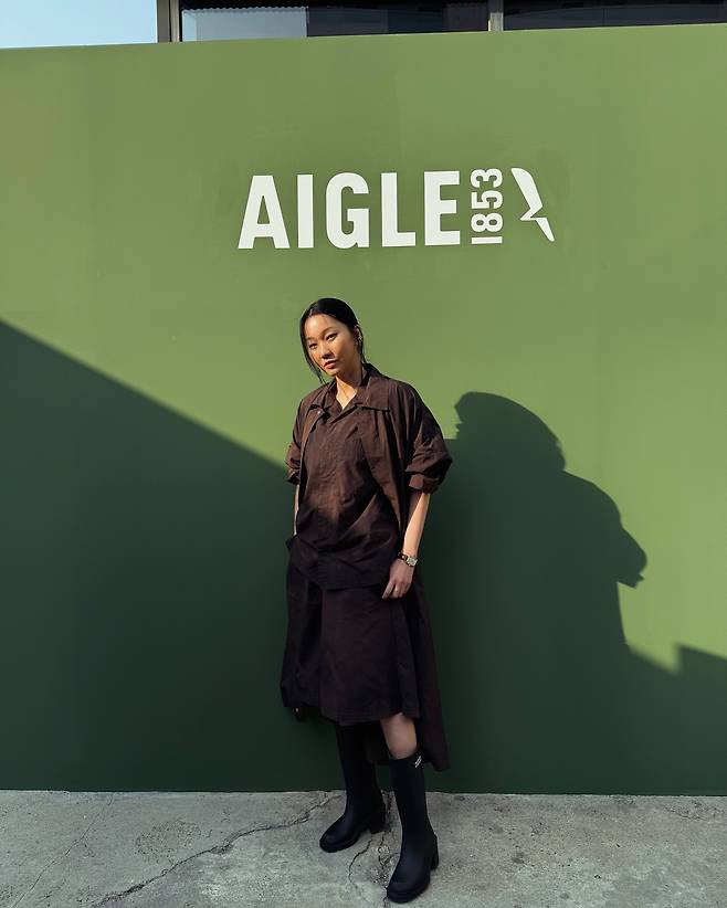 장윤주는 올블랙의 셔츠형 원피스와 롱코트, 그리고 블랙 레인부츠를 착용해 실용적이면서도 트렌디한 아웃도어 패션을 완성했다. 자연스러운 헤어스타일과 미니멀한 액세서리로 브랜드 행사장 분위기에 어울리는 시크함을 강조하고 있다.