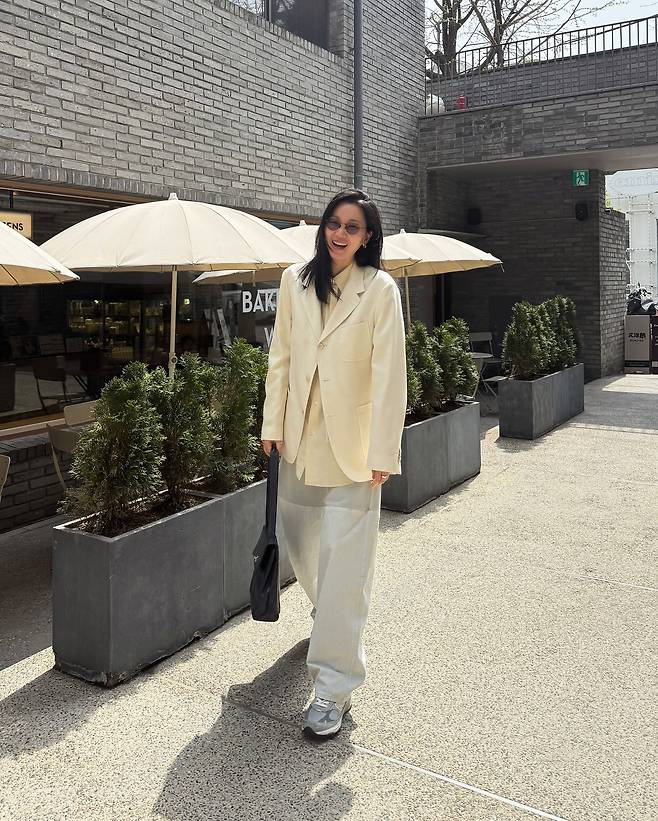 장윤주는 크림색 오버핏 재킷과 와이드 팬츠, 그리고 뉴트럴 컬러 셔츠를 매치해 도시적인 오피스 캐주얼룩을 연출했다. 그레이 스니커즈와 블랙 숄더백으로 실용성을 더했으며, 자연스럽게 내린 머리와 선글라스로 세련된 이미지를 완성했다.
