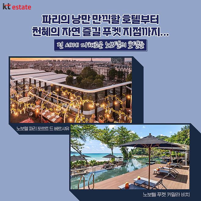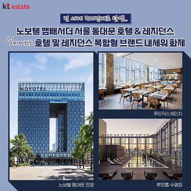 그중 노보텔 앰배서더 동대문은 세계 최초로 호텔 및 레지던스 복합형 브랜드를 내세우고, 국내 최초 AI 호텔 서비스를 도입하였으며, 노보텔 브랜드의 패밀리(Family) 정책에 기반하여 다양한 키즈 컨셉룸을 선보이는 등 업계를 선도하는 행보를 이어오고 있습니다. 얼마 전, 6주년을 맞이해 국내 최고 특급호텔로 성장해 나가는 노보텔 앰배서더 동대문의 행보를 촉망하며, 앞으로 KT에스테이트에서는 전 세계의 우수한 호텔 브랜드를 소개해 드릴 테니 다음 편도 기대해 주세요!