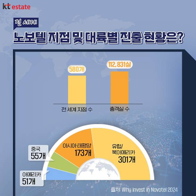 노보텔은 프랑스어로 ‘새로운’이란 뜻을 지닌 ‘누보(Nouveau)’와 호텔(Hotel)’이 결합해 만들어진 이름으로 ‘세상에 없던 새로운 호텔’이라는 뜻을 담고 있습니다. 노보텔은 2023년 기준으로 전 세계에 580개 지점을 두고 있으며, 총객실 수는 11만2831개에 달합니다. 가장 많은 호텔 수는 유럽과 북아프리카(301개)에 있으며, 그다음으로 아시아 태평양 지역(173개), 중국(55개), 그리고 아메리카(51개) 순으로 집계됩니다.
