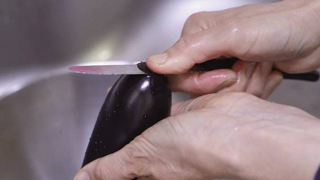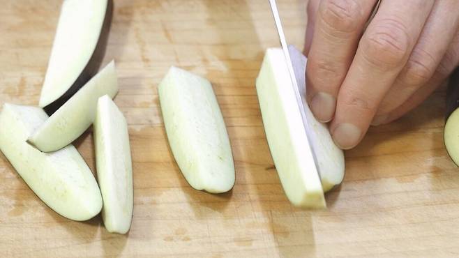 이제 가지를 한입에 먹기 편한 크기로 썰어주세요. 화면과 같이 썰면 먹기 좋아요.