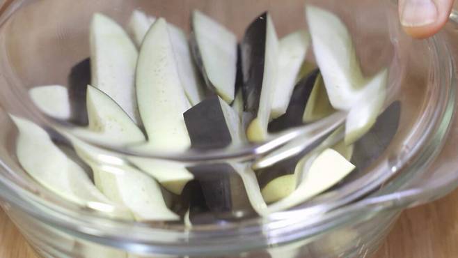 이제 전자레인지용 그릇을 준비하고 썰어 놓은 가지를 넣어줍니다. 그리고 뚜껑이나 랩으로 씌워주세요.