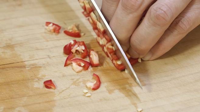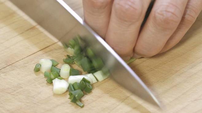 쪽파 2 뿌리는 송송 썰어주세요. 마늘 2알은 바로 다져 사용하세요. 홍고추 반 개는 송송 썰어 씨를 제거하세요.