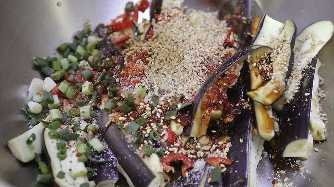 야채, 양조간장 1T, 참기름 & 들기름 1/2T씩, 설탕 1/4T, 고춧가루 1/3T, 깨 2/3T, 소금 1/3T 양념장 재료를 볼에 넣고 가지를 무치세요. 간은 기호에 맞게 조금씩 조절하면 더욱 맛있어요.