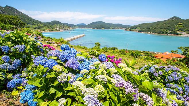 배로 단 3분, 짧은 여정 끝에 도착하는 이곳은 여름이면 수국이 넘실대는 해상 정원으로 변신한다.