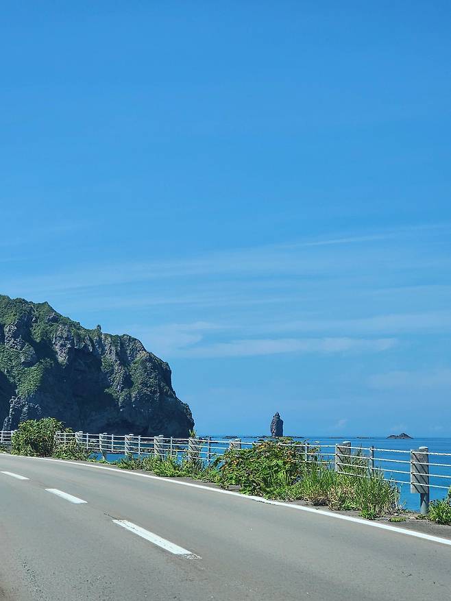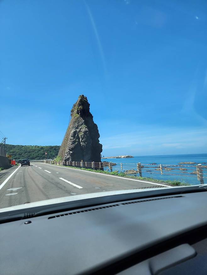 자동차를 돌려 나와 해안 도로를 따라 조금 달리다 보니 기암괴석들과 함께 저 멀리 카무이 바위가 보인다. 이렇게라도 봤으니 다행이다. 다음번엔 꼭 끝까지 가서 등대와 바위와 함께 샤코탄 블루를 다시 만나봐야지.