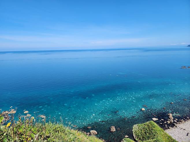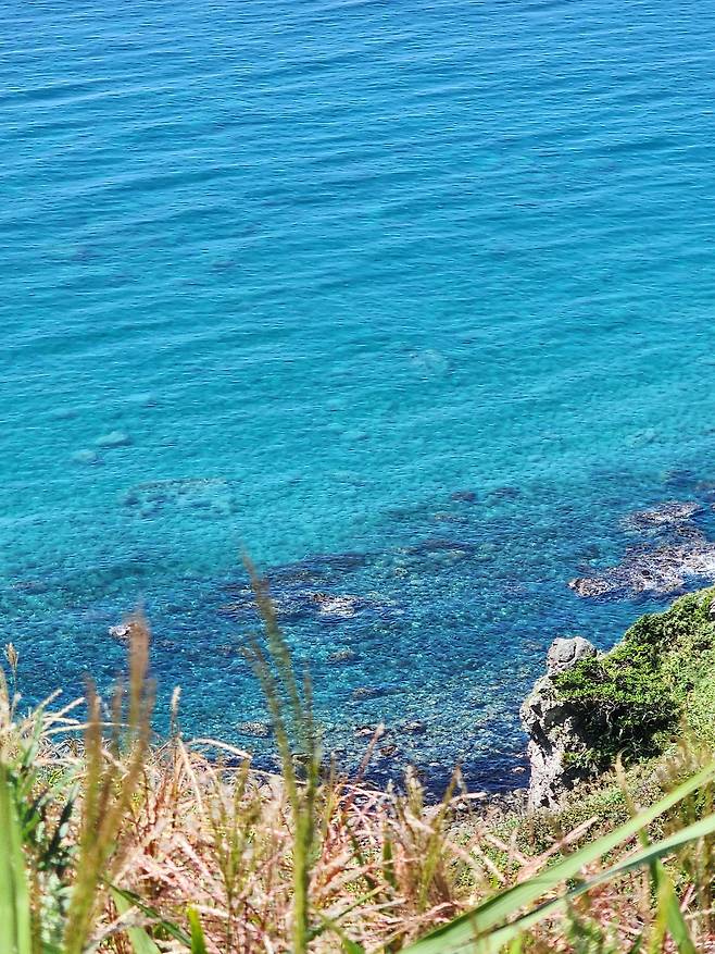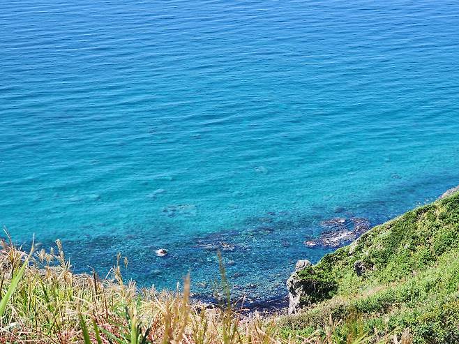 비석을 지나 언덕을 조금 올라가다 보면 금세 비경과 마주친다. 높은 절벽 위에서 바라보는 바다. 그리고 드디어 내 눈에 들어온 진정한 샤코탄 블루. 날숨을 도로 삼킬 수밖에 없는 신비로운 색이 두 팔 벌려 나를 맞이했다.