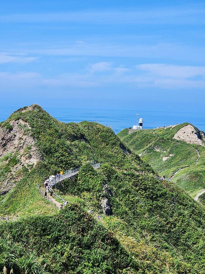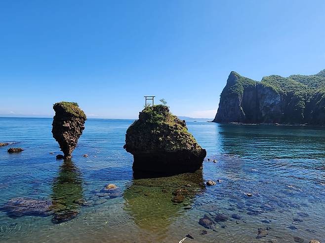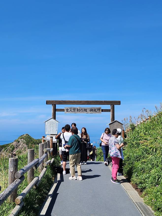 조금 더 올라가니 여자는 들어가지 못한다는 ‘여인 금제의 문(女人禁制の門)’이 있다. 과거에 카무이 곶이 여성 출입 금지 구역이었다는 것을 보여주는 흔적인데, 물론 지금은 누구나 드나들 수 있다. 이 문을 지나면 바다를 향해 뻗은 카무이 곶이 한눈에 들어온다. 산등성이 위로 난 산책로는 그 자체로도 멋진 경치를 뽐내고, 저 멀리 카무이 곶 끝자락에 하얀 등대의 모습이 어른거린다. 오른쪽 뒤로는 염불 터널(念仏トンネル), 왼쪽 뒤로는 타코 바위(立岩)가 보인다.