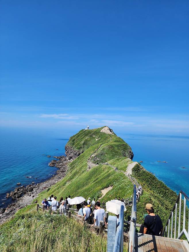 사실 카무이 곶에서 이렇게 맑은 하늘에, 바람도 잔잔해서 끝까지 걸어가 볼 수 있는 날씨를 만나는 게 쉬운 일이 아니라고 한다. 기상 상태에 따라서 출입이 금지되는 경우도 많다, 날이 맑아도 바람이 강해 산책로가 폐쇄되기도 하고, 비가 많이 오거나 안개가 많이 껴도 폐쇄된다고 한다. 그냥 흐린 정도엔 개방하지만, 그러면 샤코탄 블루를 지금처럼 선명하게 즐기기 힘들다.