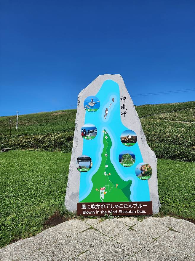 카무이 곶 자연공원(神威岬自然公園)으로 들어서서 주차를 하면, 카무이 곶으로 향하는 언덕길 초입에 안내도가 그려진 비석이 관광객들을 맞이한다. ‘바람에 날리는 샤코탄 블루(風に吹かれてしゃこたんブルー)’라는 표제어에 가슴이 두근거린다.