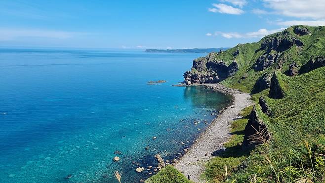 이 색을 무어라 표현해야 할까? 강원도의 바다만 해도 짙고 푸르고 거친 이미지가 떠오르는데, 여긴 강원도보다 위도가 한참 높은 곳이지 않은가. 그런데 저 색은 뭐지? 여기가 홋카이도가 아니라 오키나와인가? 제주도에서나 볼 법한 남국의 바다색. 옥빛으로 빛나는 투명한 샤코탄 블루가 거기 있었다. 감동이라는 말로는 부족한, 온몸을 때리는 듯한 울림에 부르르 전율이 흐른다.