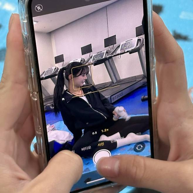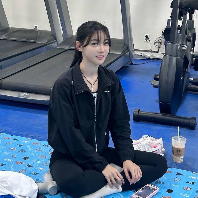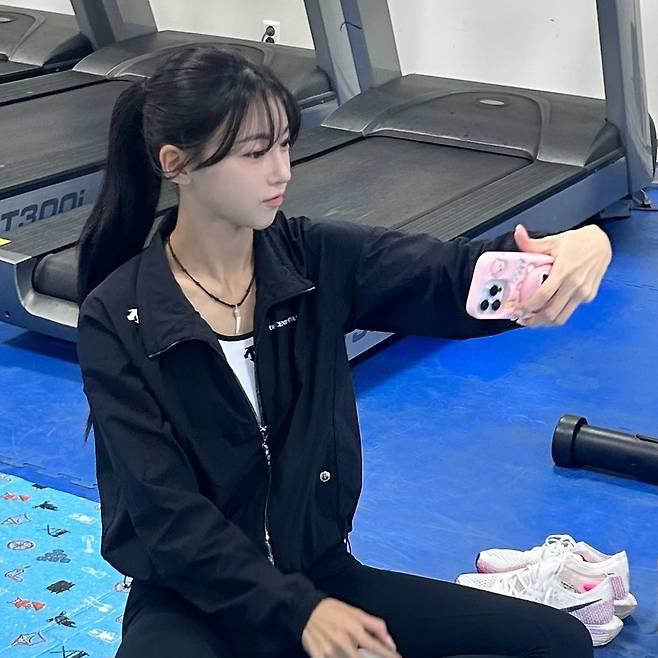 사진 속 김민지 씨는 블랙 컬러의 활동적인 트레이닝복 상의를 입고 핑크색 휴대폰으로 본인의 모습을 담고 있는데요.